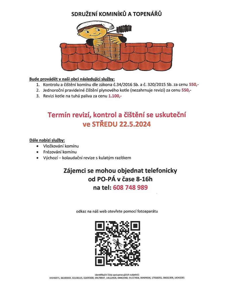 Termín revizí, kontrol a čištění se uskuteční se uskuteční ve středu 22.5.2024