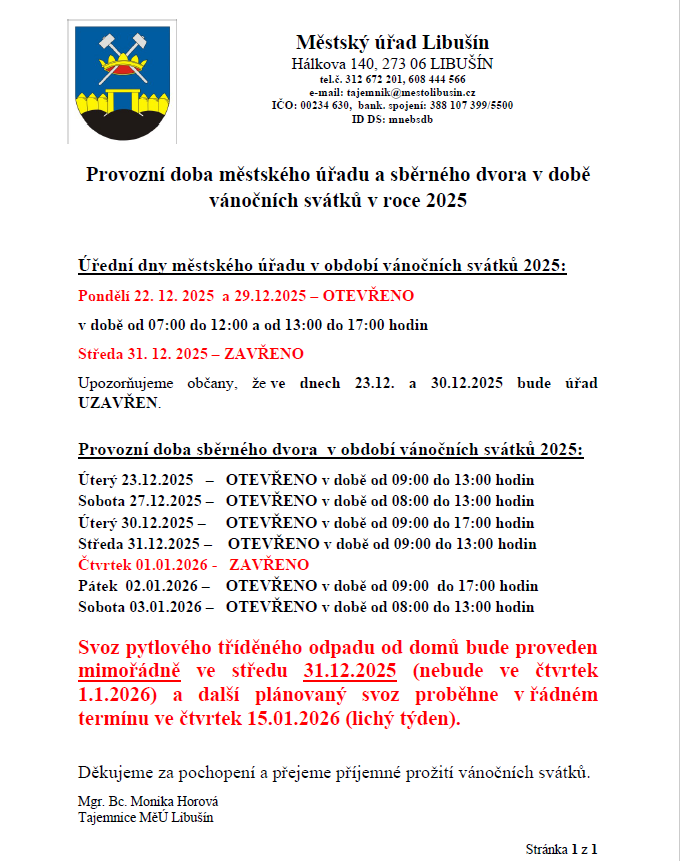 Městský úřad a sběrný dvůr oznamují změny v provozní době během vánočních svátků 2025.